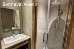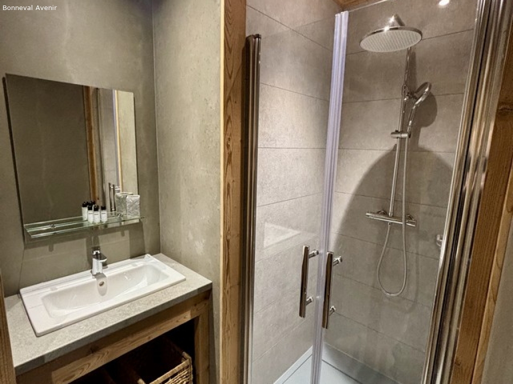- 1 salle de bain avec douche à l'italienne, vasque, sèche serviettes, sèche-cheveux.