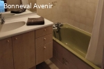 - Salle de bain avec baignoire et meuble-vasque, sèche-cheveux mural.